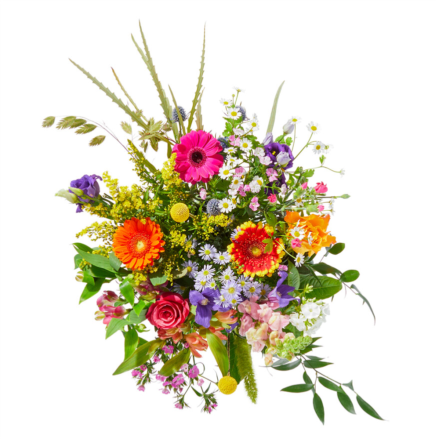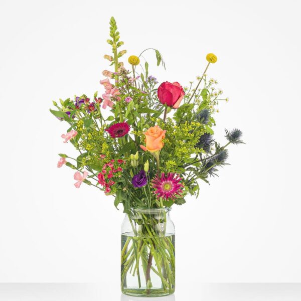 Wauw, dit boeket is echt een plaatje! Wil je iemand feliciteren, opvrolijken of bedanken? Dan is dit boeket het perfecte cadeau. Door de opvallende en kleurrijke bloemen in plukstijl, vrolijkt dit boeket iedereen op. (excl. vaas)