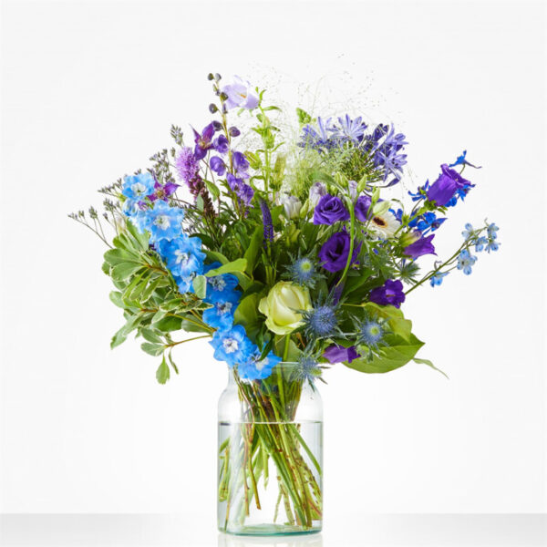 Een prachtig paars boeket met een vleugje blauw. Een echte blikvanger voor elke gelegenheid. (excl. vaas)
